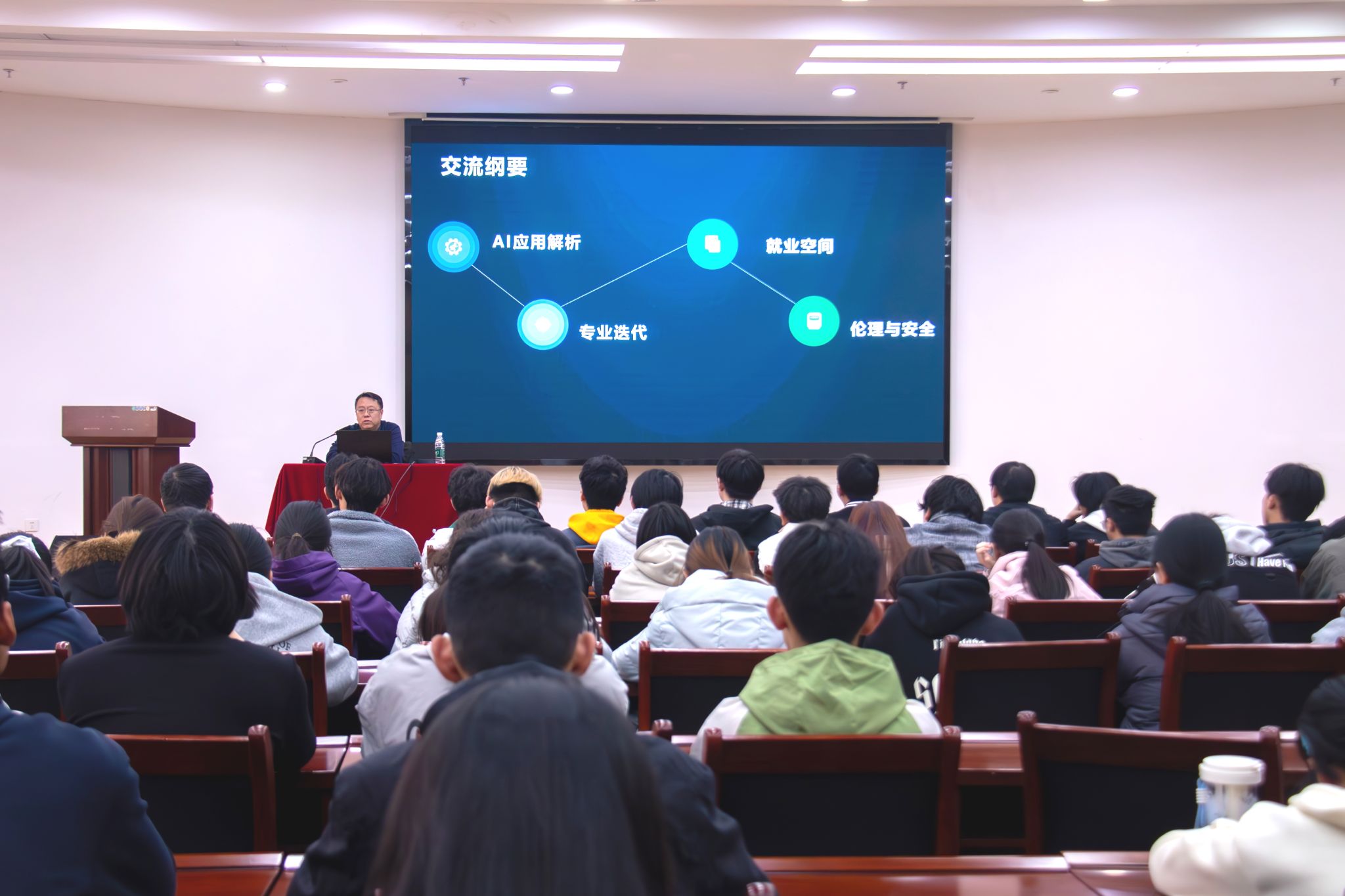 在讲座中,王雪冰老师以“AI赋能 智创未来”为主题,从AI应用解析、专业迭代、就业空间、伦理安全等四个方面为同学们详细解读了人工智能发展趋势,未来行业需求和职业发展,鼓励同学们在校期间扎实科研,充分利用学院提供的良好学习实践平台,主动拥抱产业变化,努力成长为具有创新实践能力的复合型高素质应用型人才。