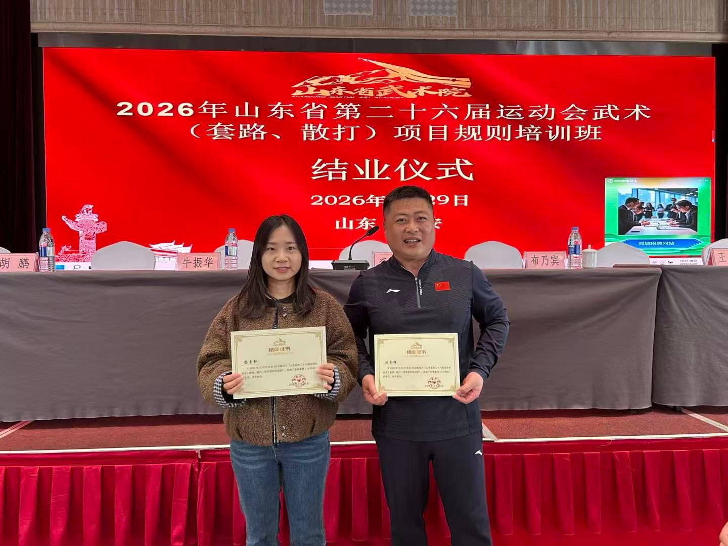 为保障山东省第二十六届运动会武术赛事公平规范开展,3月28-29日,省武术院在泰安举办山东省第二十六届运动会武术(套路、散打)项目规则培训班。我院体育教师彭鲁静、刘含辉受邀参加本次培训。