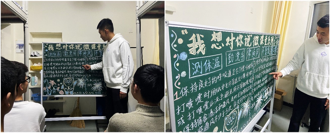 2021级计算机类专业张旭瑞同学为第一期微课堂主讲人,他主讲的题目是《共同防疫,自律自强》。他从学校疫情防控管理规定讲起,指出宿舍卫生安全是学校疫情防控工作的重点,同学们要严格要求自己,从生活的点滴小事做起,比如保持宿舍干净卫生,常通风、勤洗手,养成良好的卫生习惯,加强体育锻炼,提高自身免疫力,科学佩戴口罩,减少聚集性的活动,每日及时进行体温检测,配合好疫情监测工作,做到早发现、早报告、早隔离、早治疗,如出现发热等异常症状,及时向辅导员报告。通过讲解,同学们更清醒地认识到宿舍卫生安全的重要性,增强了学生的安全意识,为平安宿舍、文明宿舍建设奠定了良好的基础。其他宿舍楼的宿舍微课堂将陆续展开。